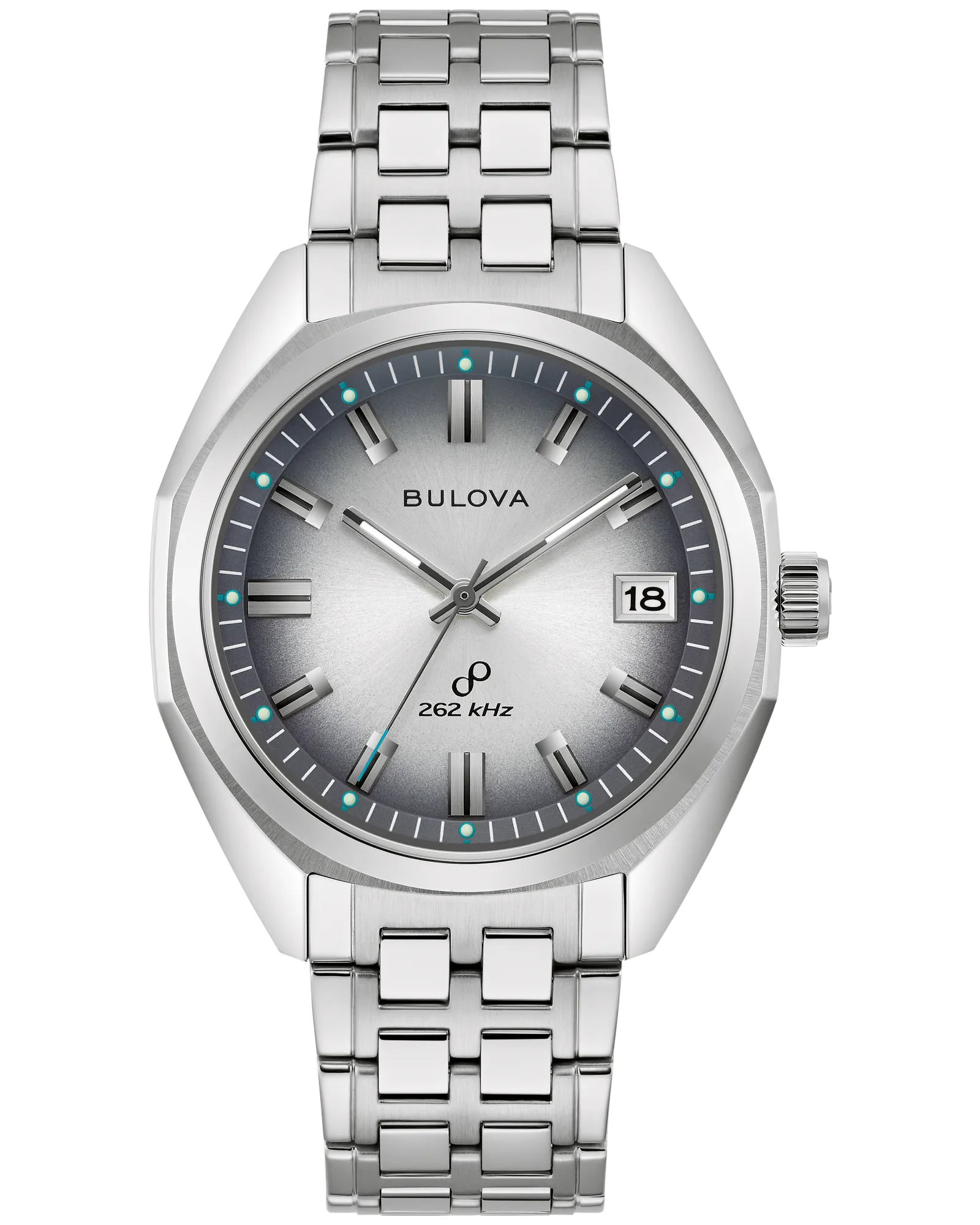 Straight from the 1970s comes the Bulova 1973 Jet Star, an iconic model from the brand’s impressive history, now equipped with an equally impressive movement. Inspired by the original, the silver-tone stainless steel case features a striking angular design with broad facets and a domed sapphire crystal. The silver sunburst dial is accented by a gray chapter ring, applied hour markers, and matching silver-tone hands. Luminescent plots at each hour and fill in the hands allow for exceptional legibility in every environment, while a date display sits perfectly at 3 o’clock. The new Jet Star is powered by Bulova’s proprietary high-precision quartz Precisionist  movement, a revolutionary 8-jewel quartz mechanism vibrating at a remarkable 262kHz, accurate to seconds per year  with increased resistance to temperature changes, and with a sweeping seconds hand. Complementing the stainless steel case is a matching bracelet with a deployant clasp closure and latched spring bars for easy release. Make an impression in legendary style with the high-flying Bulova 1973 Jet Star, an iconic design recreated for the modern connoisseur.