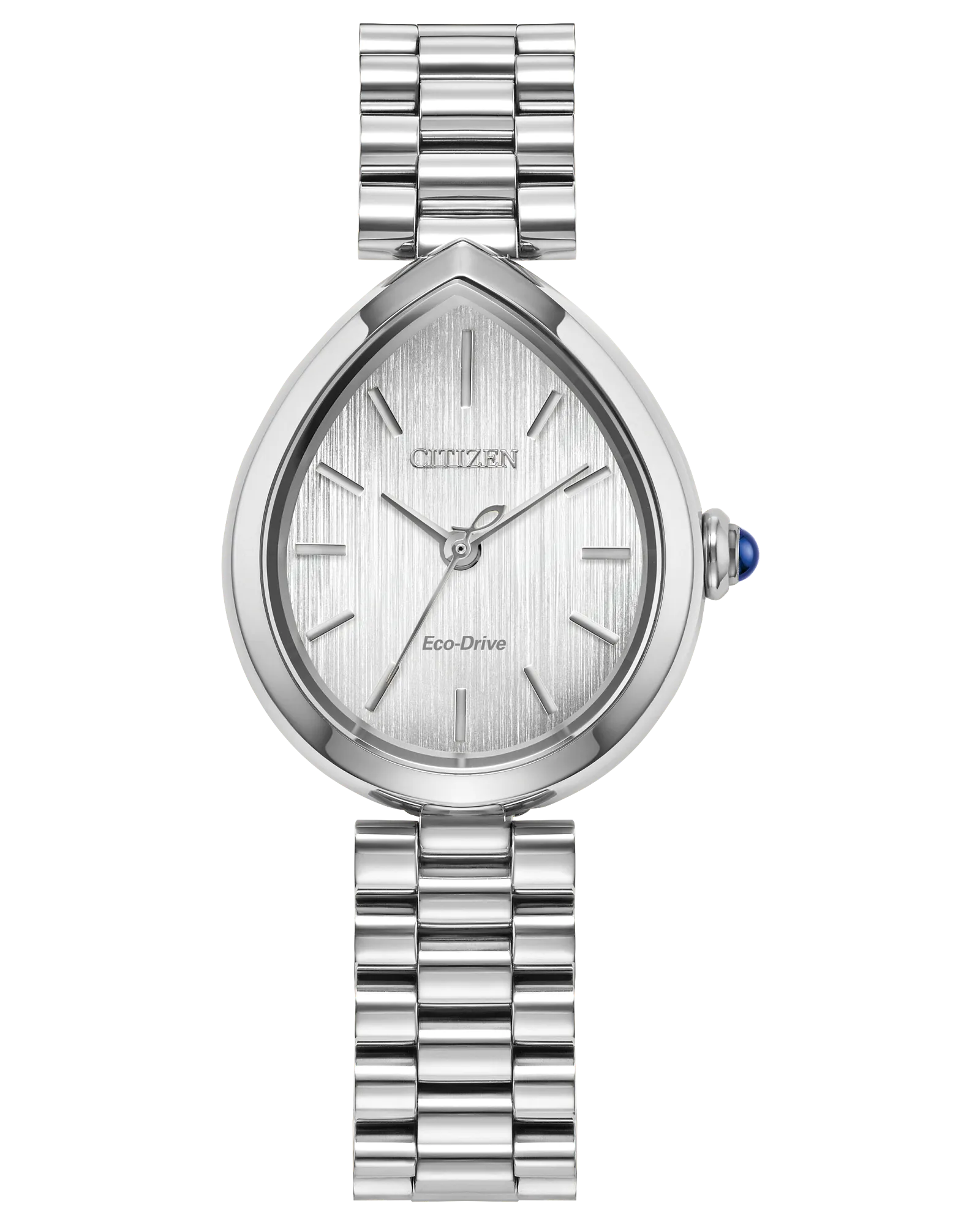 Flirty and feminine, the new Citizen L Rainell is a watch as creative and elegant as those who wear it. With subtle dimensions of 26mm by 31mm, the signature shape of the timepiece speaks for itself in understated silver-tone stainless steel. An integrated bracelet and synthetic sapphire-set crown punctuate the look. A lovely white brushed dial follows the shape of the case, playing host to refined details in applied indices and matching hands. Sustainably powered by any light with our proprietary Eco-Drive technology that never needs a battery. Water resistant up to 50 meters.