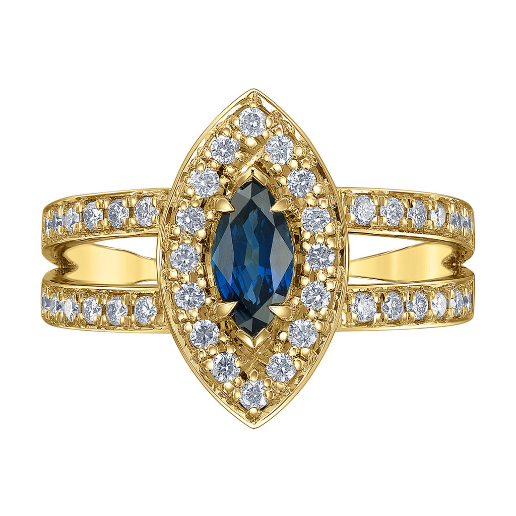 Ladies 10kt Yellow Gold Diamond and Marquise Shaped Sapphire Ring.
