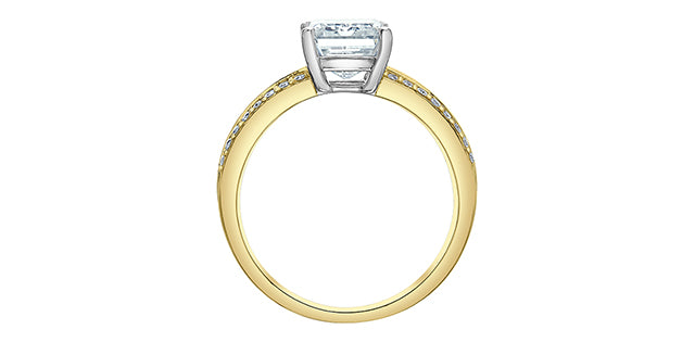 14 K yellow and white gold Lab Created Diamond Engagement Ring containing a 3.08 ct Emerald cut in the centre