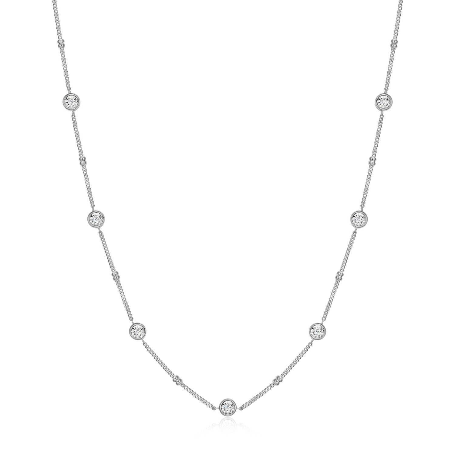 "M" lab-created diamond rhodium-plated SS bezel station beaded necklace. 16+2". 1/6 CTW.