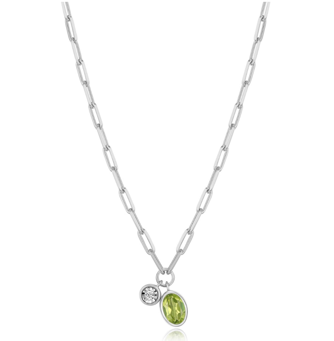 "M" August birthstone SS rhodium plated 6x4mm oval. Lab diamond