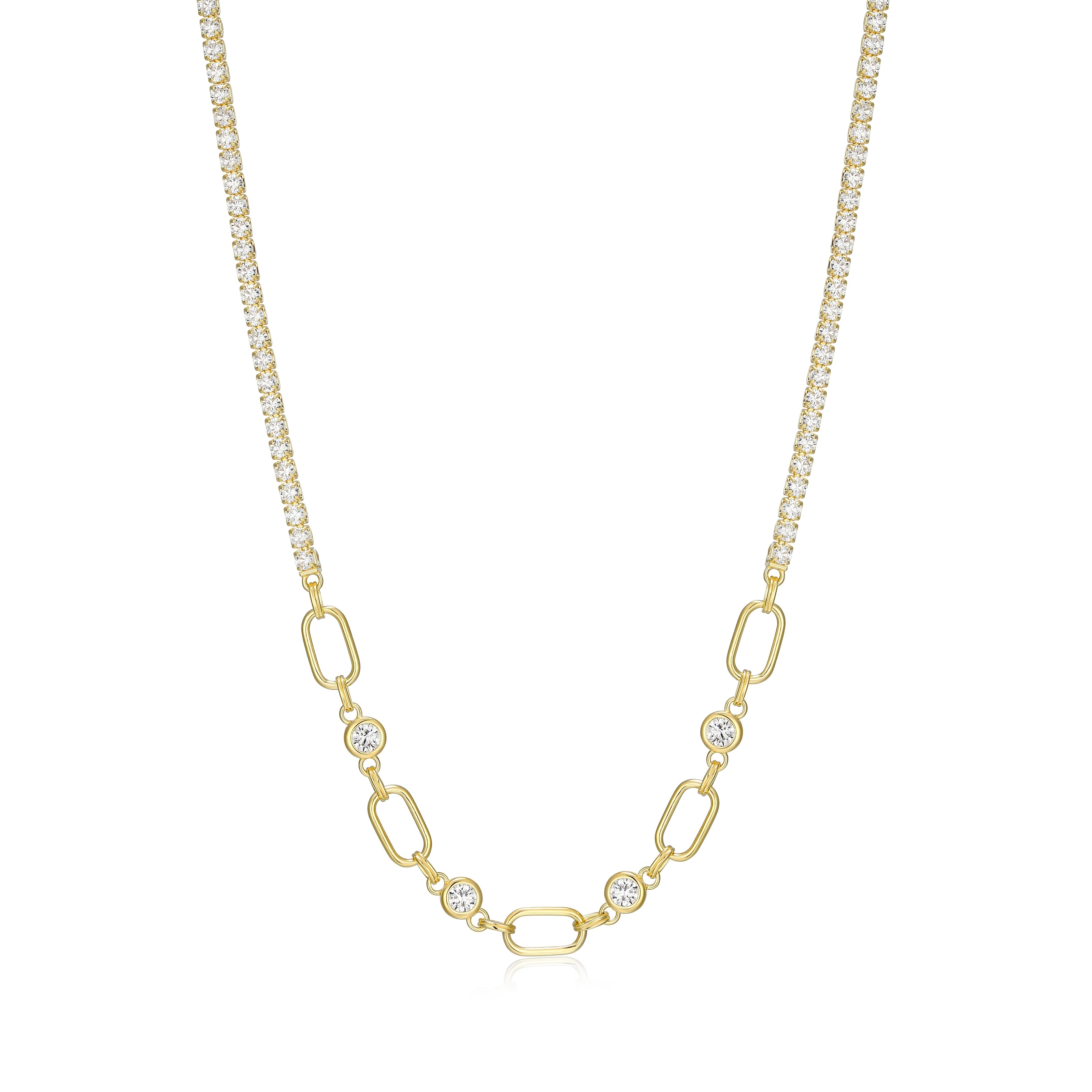 Diamondlite CZ 2mm cup chain half link tennis necklace in sterling silver with 18K gold plating.16