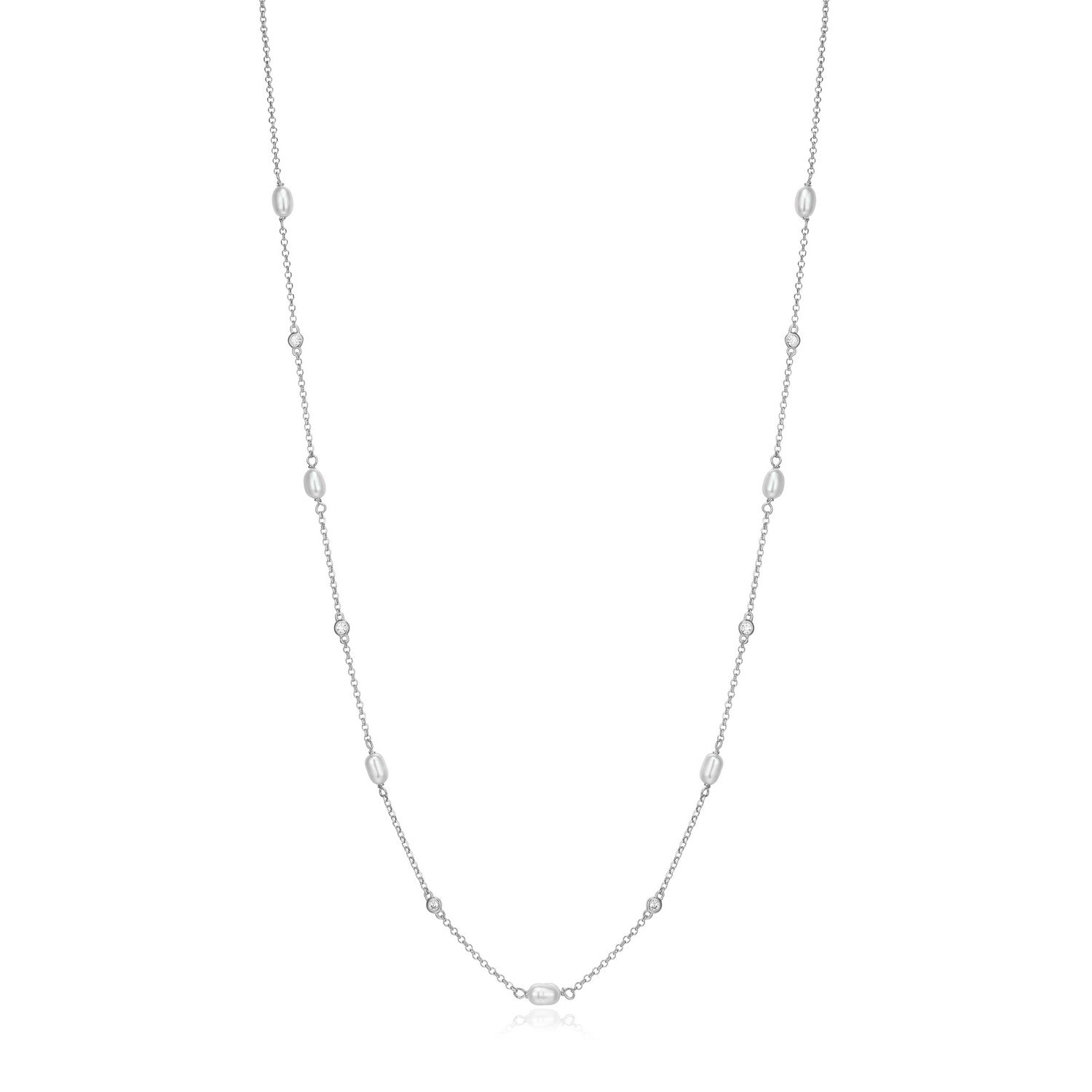 Diamondlite CZ and 6x4mm genuine pearl adjustable station necklace in sterling silver