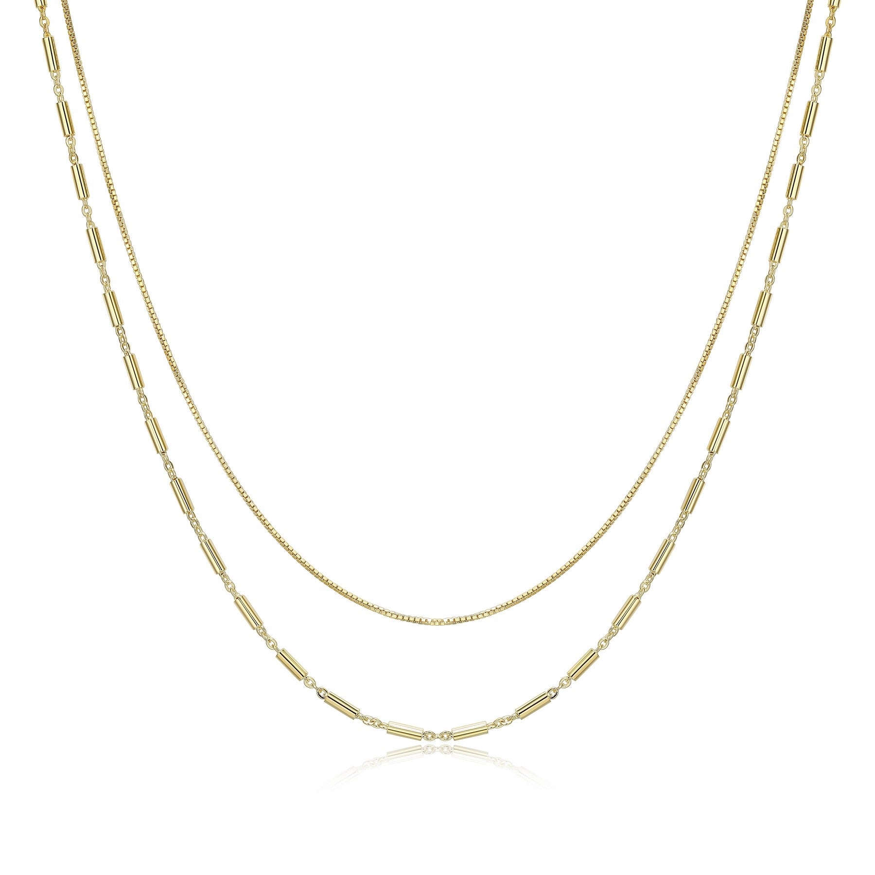 Layered box and tube link cable chain necklace in sterling silver with 18K gold plating. 16"+2".