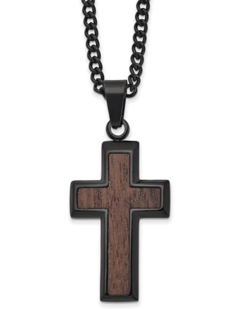 SRN2829-24 Stainless Steel Black IP-plated w/Wood Inlay Cross