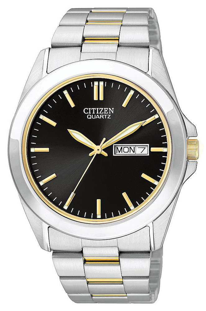 This CITIZEN® Quartz timepiece features a two-tone stainless steel case and bracelet with a black dial. It is complete with a day/date function and luminous hands and markers.