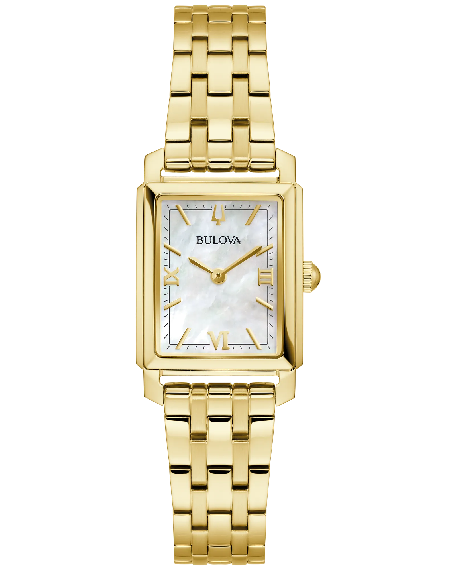 This all-new Bulova women’s timepiece brings a luxurious elegance to the already impressive Sutton Collection. The refined gold-tone stainless steel rectangular case features a mineral crystal and finishing that shines brilliantly in the light. The lustrous mother-of-pearl dial is accented with gold-tone Roman numeral markers and hands for a look of true elegance. A matching five-link gold-tone stainless steel bracelet features a deployant closure with pushers for a perfect fit and latched spring bars for easy release. This Bulova ladies’ timepiece offers an understated sense of luxury for the woman with an elevated sense of style.