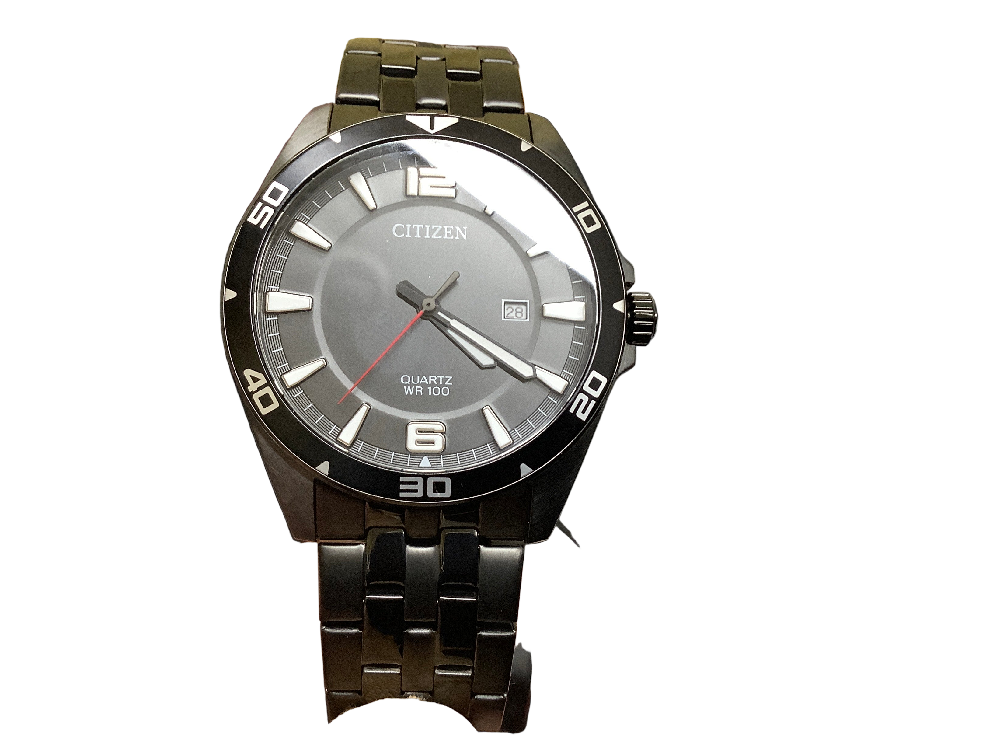 Men’s black quartz watch. WR100, stainless steel bracelet